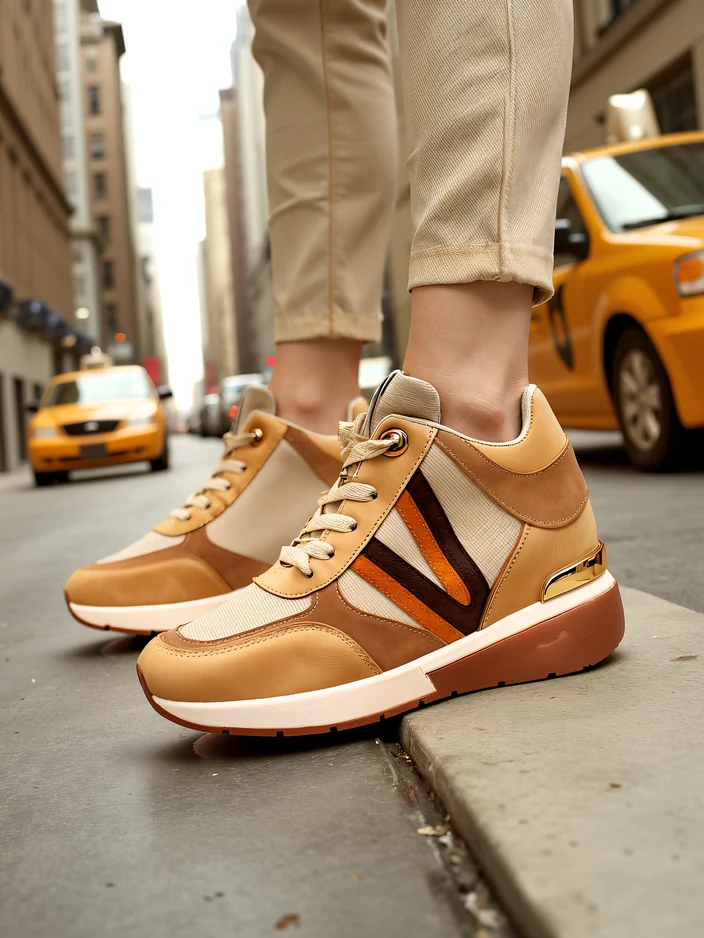 - Bequeme Damensportschuhe mit verborgenem Keil, aus Öko-Leder gefertigt. Modell mit Schnürsenkeln, Stoffeinlegesohle. Das elastische Obermaterial passt sich leicht dem Fuß an. Ein super stylisches Accessoire!