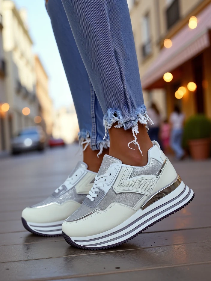 - Damensportschuhe im Sneaker-Stil mit einer dickeren Sohle. Hergestellt aus Eco-Leder und Glitzer-Material mit einer Stoffeinlage. Eine großartige Ergänzung für Ihre alltäglichen Freizeitoutfits!