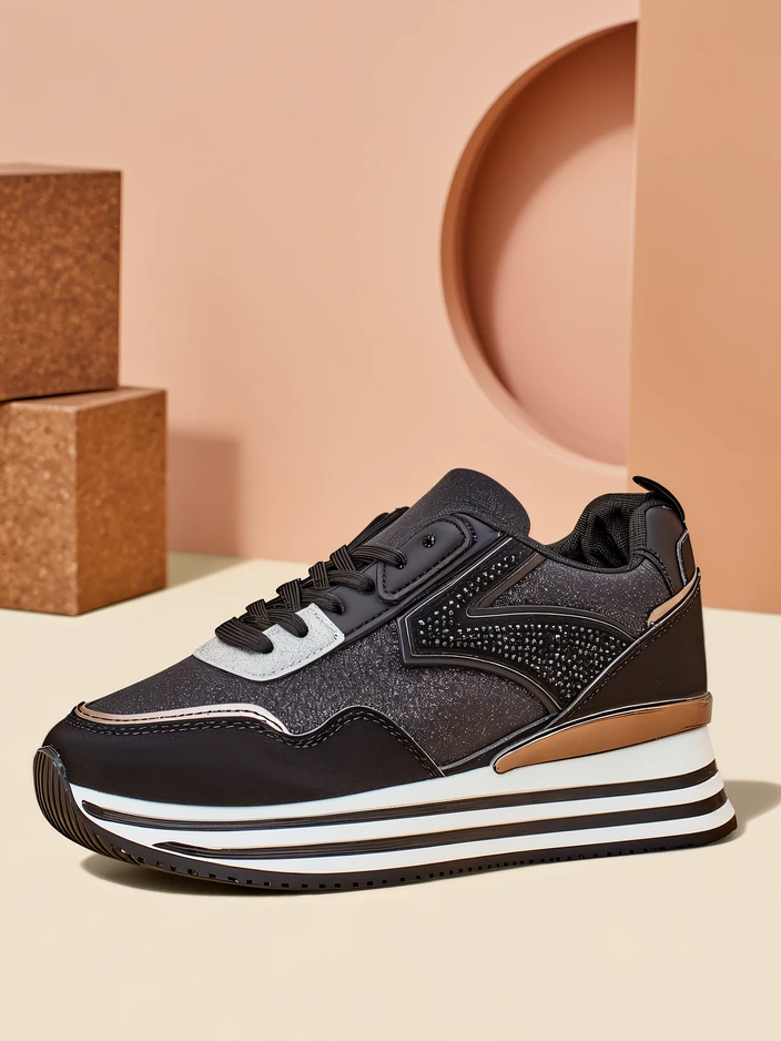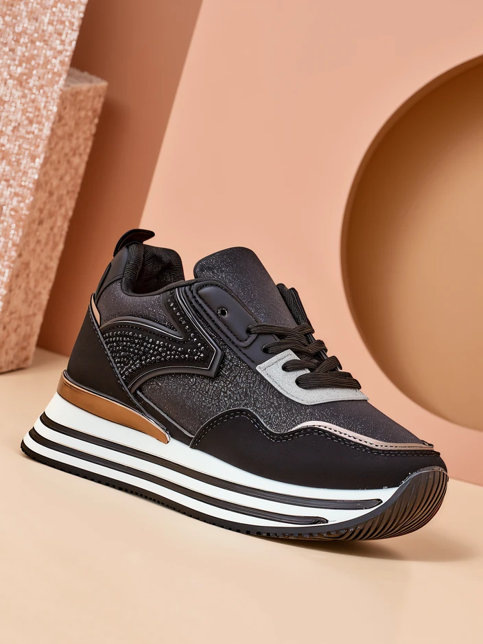 - Damensportschuhe im Sneaker-Stil mit einer dickeren Sohle. Hergestellt aus Eco-Leder und Glitzer-Material mit einer Stoffeinlage. Eine großartige Ergänzung für Ihre alltäglichen Freizeitoutfits!