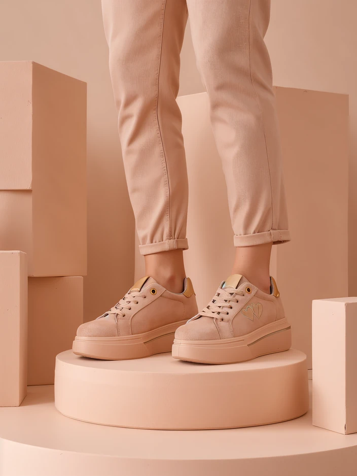 - Damen Sport Sneakers auf flacher Sohle, aus ökologischem Wildleder-Obermaterial. Das Modell verfügt über eine ökologische Lederinnensohle und ist mit gestickten Herzen verziert. Kombinieren Sie sie mit weiten Hosen und einem Hemd!