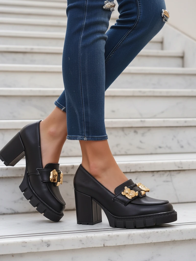 - Klassische Damen-Mokassins mit Absatz. Das Modell ist komplett aus Öko-Leder gefertigt. Die Schuhe haben eine dezente Verzierung am Schaft. Eine ideale Basis für jeden Tag!