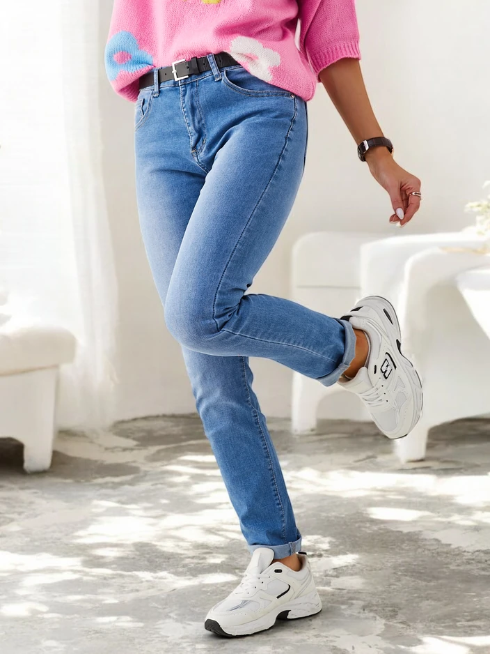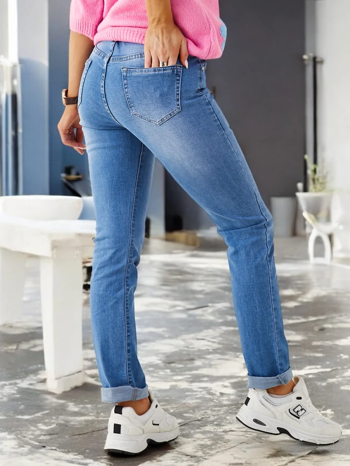 - Damenjeans aus Baumwollstoff. Mittelhohes Modell, mit einem Knopf und Reißverschluss zu schließen. Zwei Paar Taschen - hinten und vorne. Ein Hit in dieser Saison!