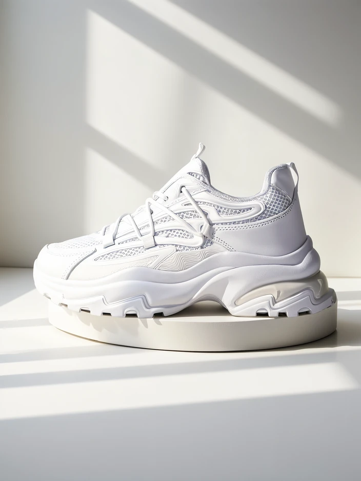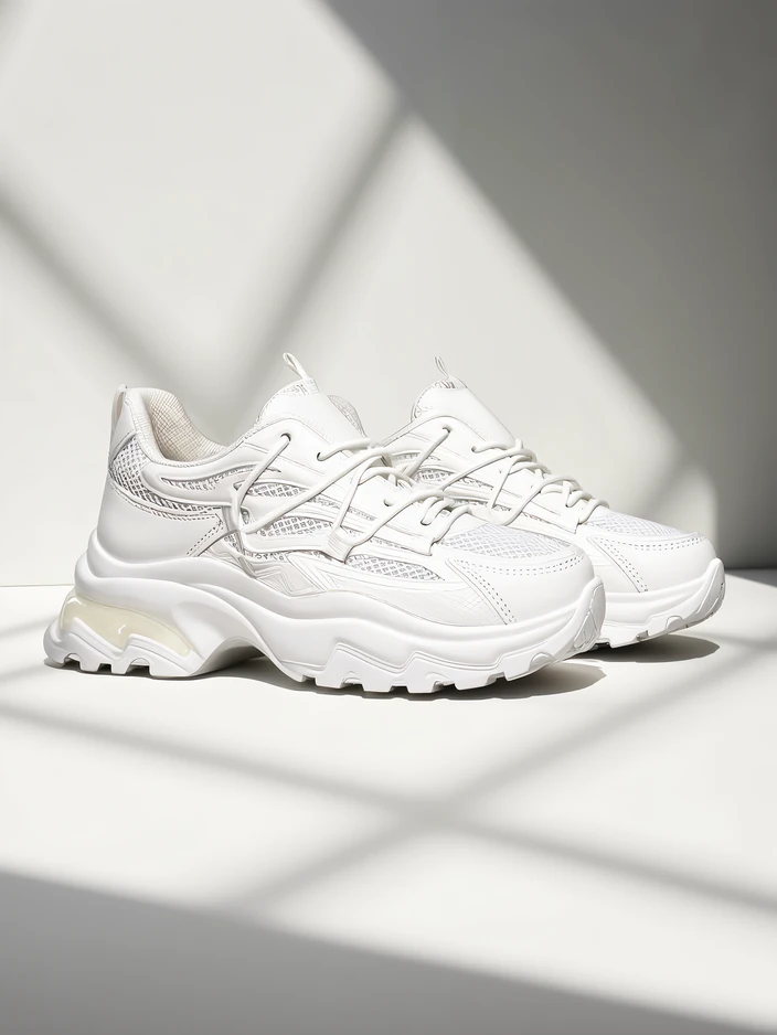 - Damen Sport Sneakers mit einer flachen Sohle, aus Ökoleder und Stoff mit Gummi-Einsätzen. Das Modell verfügt über eine textile Einlegesohle und eine dickere Sohle. Kombinieren Sie sie mit weiten Hosen und einem Hemd!