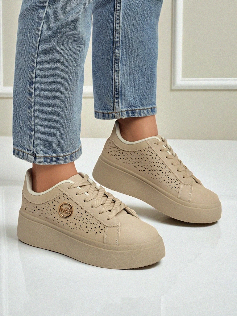 - Ajouré-Sneakers für Damen aus Öko-Leder und Textileinlegesohle auf einer Plateausohle, die Komfort mit modischem Stil verbinden. Ideal für den Alltag, bieten sie Leichtigkeit und Bequemlichkeit, während das dezente Design jedem Outfit Eleganz verleiht.