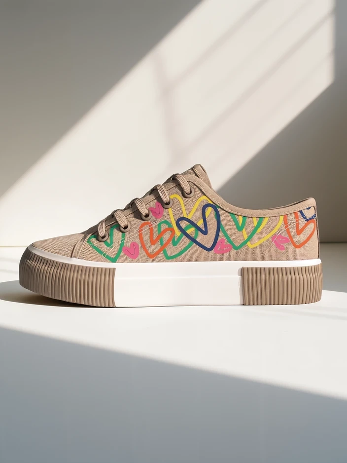 - Damensneaker aus Stoffmaterial. Das Obermaterial ist schnürbar und mit einem Herzmuster verziert. Die Sohle ist aus klassischem Gummi. Diese Schuhe sind perfekt für den Alltag!