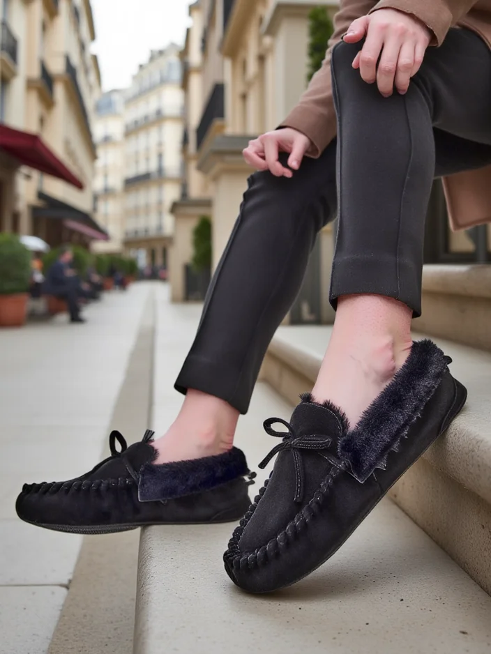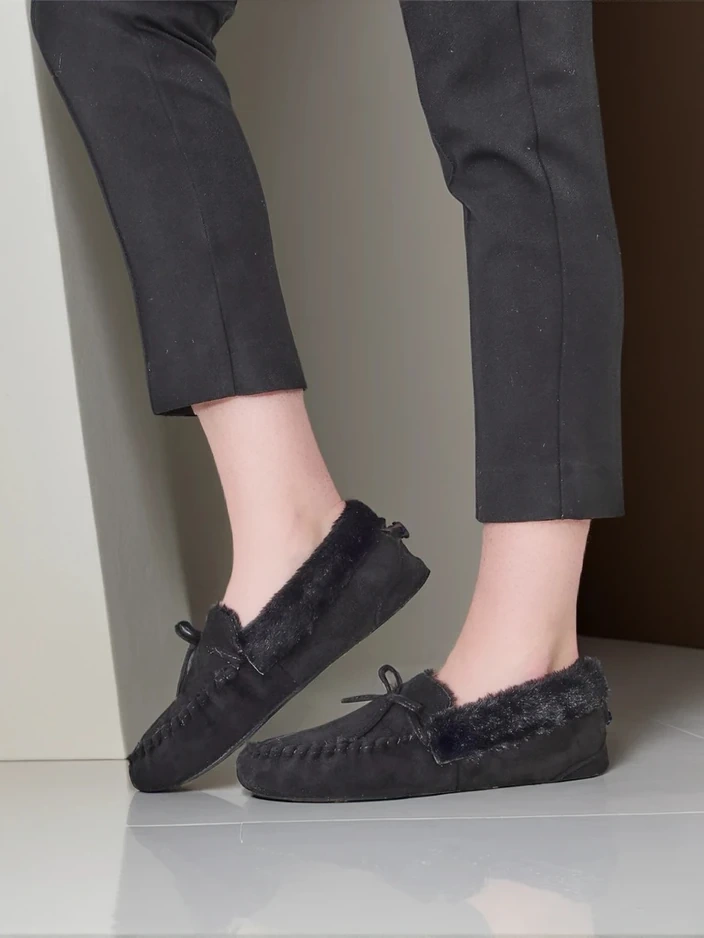 • Stylishe Damenmokassins mit flacher Sohle. Das Paar besteht aus Wildleder-Eco-Leder. Das Innere ist mit Fell gefüttert. Auf der Zehe befindet sich eine dekorative Schleife. Perfekt für legere Outfits!
