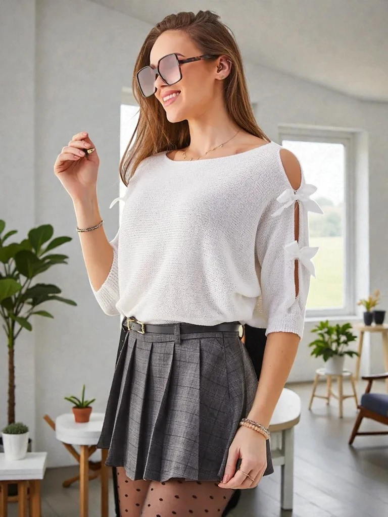 - Zmysłowy damski sweter wykonany z miękkiej tkaniny, która zapewnia komfort noszenia. Model z okrągłym dekoltem oraz rękawami 3/4. Dodatkowo zdobiony kokardkami na rękawach, dodającym uroku i kobiecości.