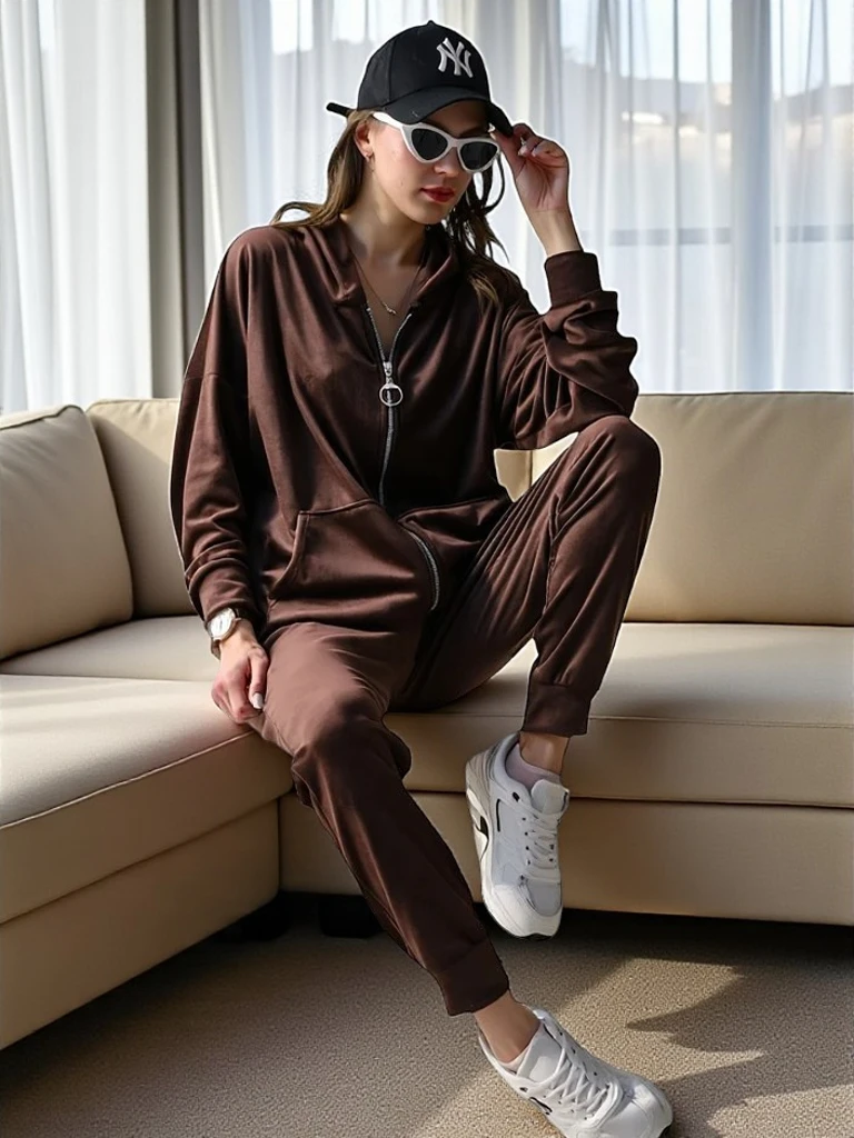 - Damen-Set a'la Samt aus angenehmem Material. Zip-Hoodie mit Kapuze. Lange Hose mit elastischem Bund, 2 Taschen. Fühlen Sie den Stil in diesem wunderbaren Set!