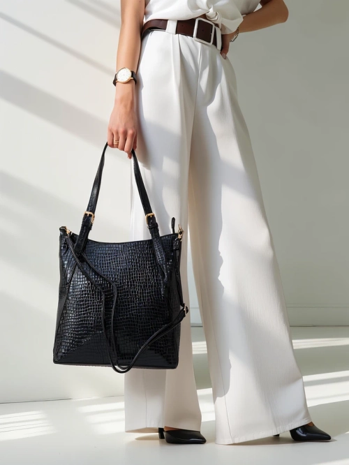- Eine große Damenhandtasche aus lackiertem Eco-Leder mit Prägung und Reißverschluss. Das Modell verfügt über: - 1 Fach; - 1 Außentasche mit Reißverschluss; - 3 Innentaschen;