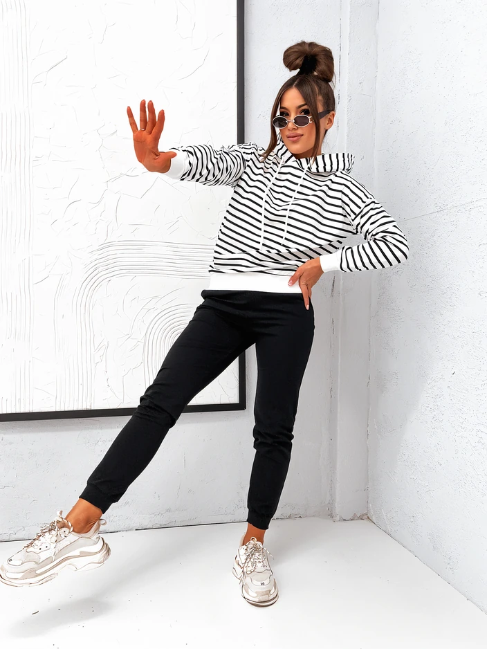 • Damen Trainingsanzug-Set aus angenehmem Stoff. Sweatshirt im Hoodie-Stil mit Kapuze. Hose mit elastischem Bund und 2 Taschen. Das perfekte Set für einen Spaziergang! HINWEIS: Messgenauigkeit (+/-) 1 cm.