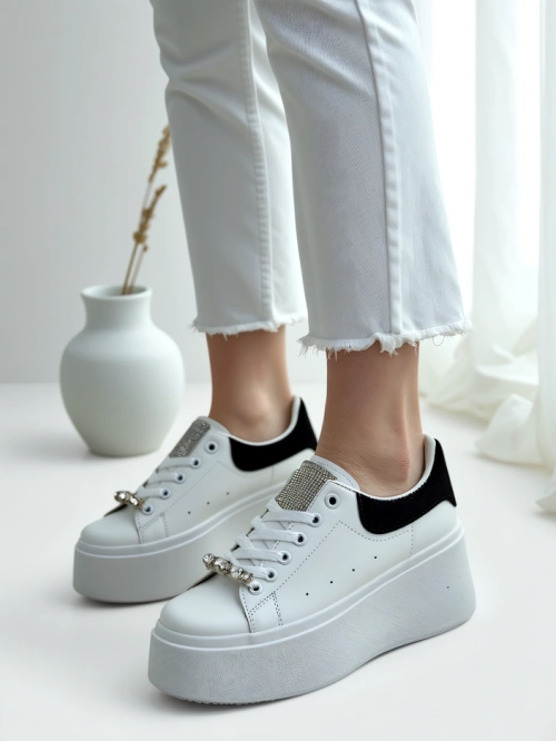 • Elegante weiße Sneaker mit funkelndem Metallic-Detail. Schuhe aus Eco-Leder und Stoffeinsätzen. Perfekt für lässige Outfits.