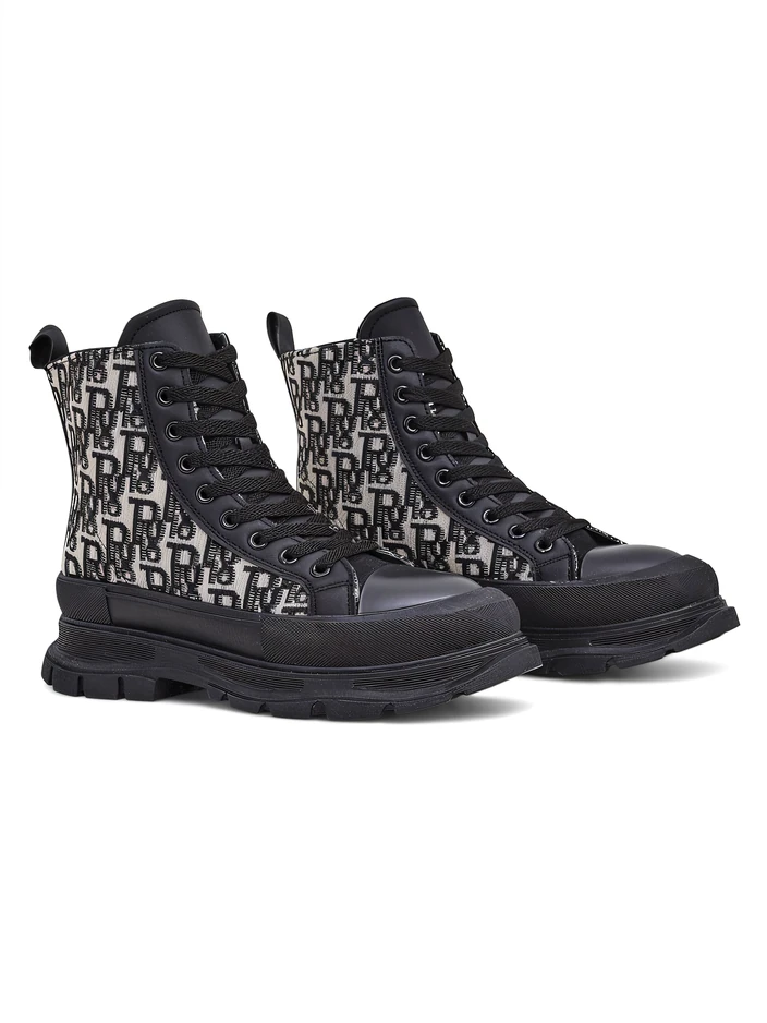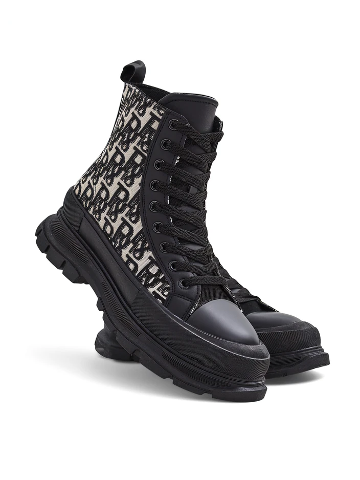 • Wunderschöne Damen-Stiefeletten mit flachem Absatz, aus ökologischem Leder und bedrucktem Stoff. Das Innere ist mit Stoff gefüttert. Schnürmodell.