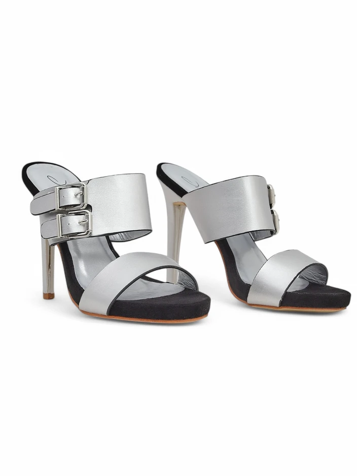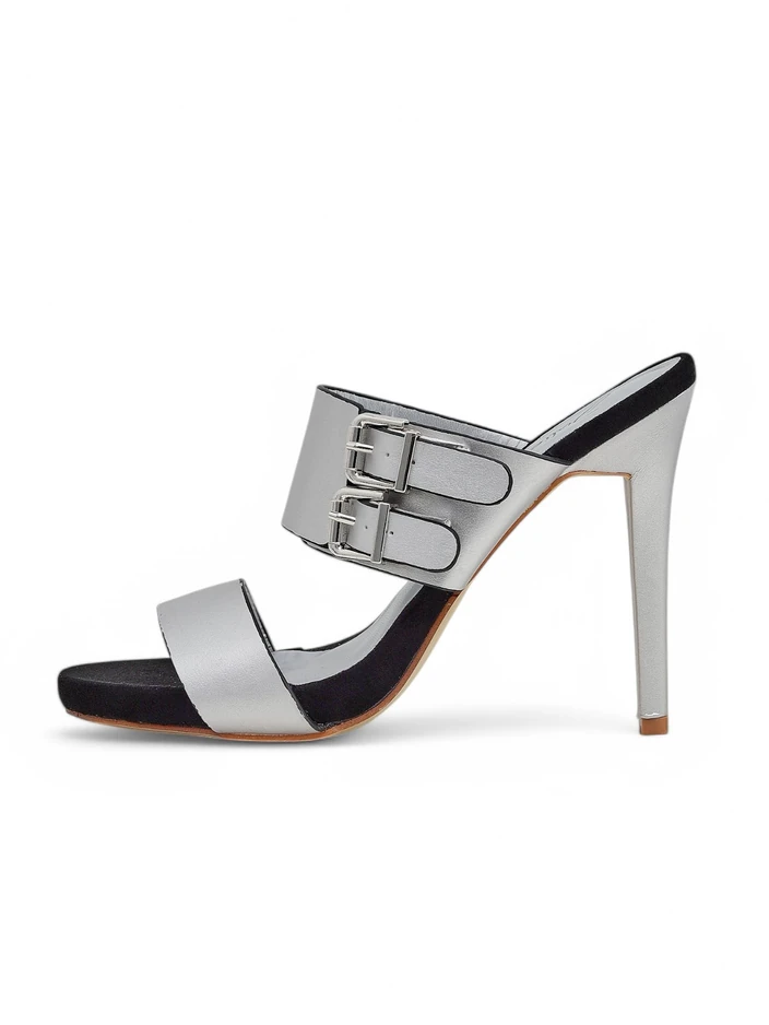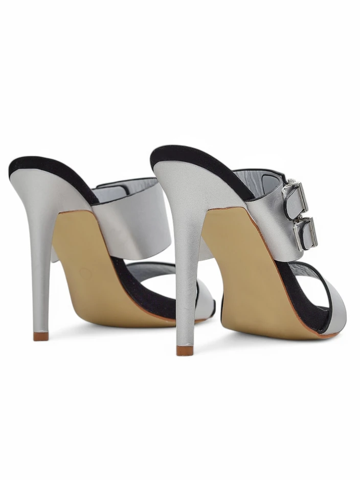Sandale Aletheia silber mit 12cm Stilettoabsatz aus ökologischem Leder mit Riemchen