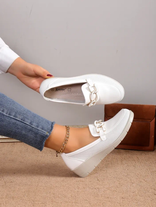 - Schöne Damen-Mokassins mit einem niedrigen Keil. Das Modell ist lässig im Rücken und besteht aus öko Leder und Mesh mit einer öko-ledernen Innensohle. Die Zehenpartie ist abgerundet und mit goldenen Elementen verziert. Eine ideale Basis für viele Alltagsl