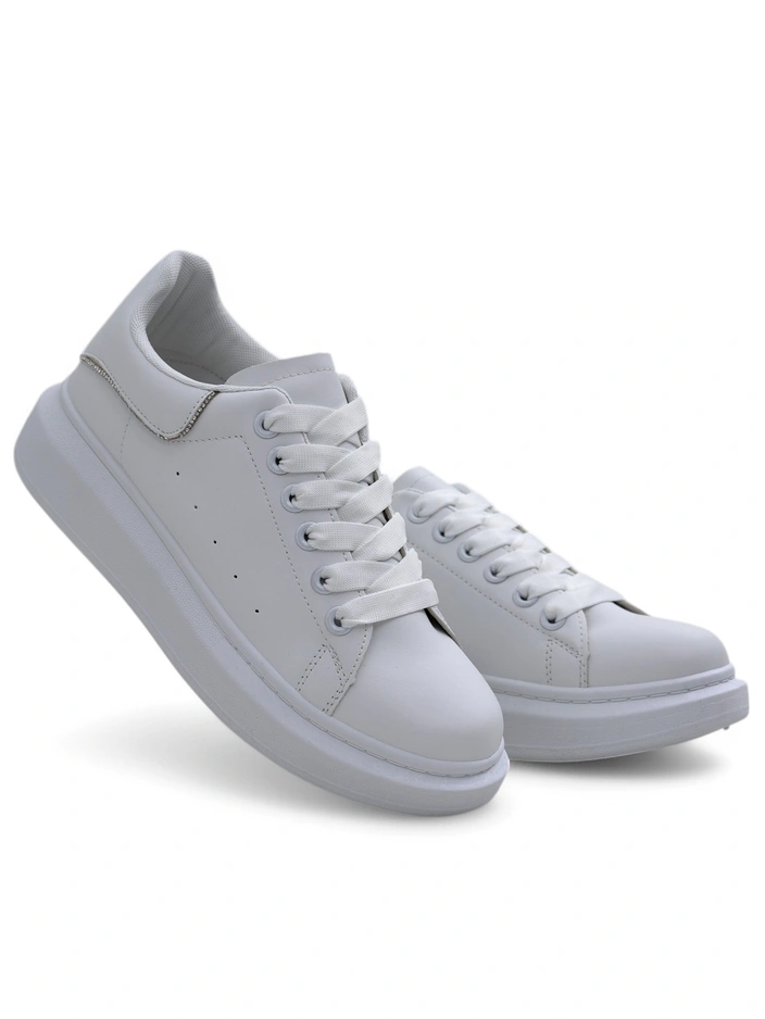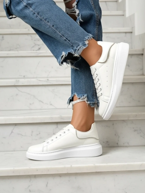 Weiße Sneakers für Damen, gefertigt aus hochwertigem Öko-Leder, sind die perfekte Wahl für alle, die Wert auf Stil und Komfort legen. Unsere Schuhe wurden mit Liebe zum Detail entworfen, was nicht nur ein attraktives Aussehen, sondern auch Langlebigkeit garantiert. Öko-Leder ist ein umweltfreundliches Material und gleichzeitig leicht zu reinigen. Die Sneakers haben einen flachen Absatz mit einer Höhe von 4,5 cm, was sie bequem für den Alltag macht. Die Stoffeinlegesohle sorgt für eine gute Belüftung, was den Tragekomfort erhöht.