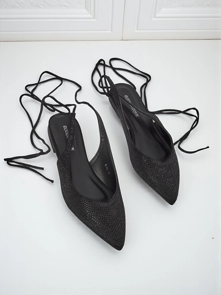- Außergewöhnliche Ballerinas aus mit Zirkonia besetztem Stoff mit spitzer Spitze. Modell mit dekorativen Schnüren zum Binden. Die weiche Innensohle aus Öko-Leder sorgt für Komfort. Perfekt für elegante und modische Stylings!