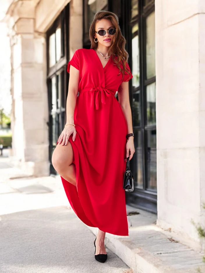Royalfashion Damen-Midikleid mit Wickelausschnitt, kurzen Ärmeln und einem Gürtel