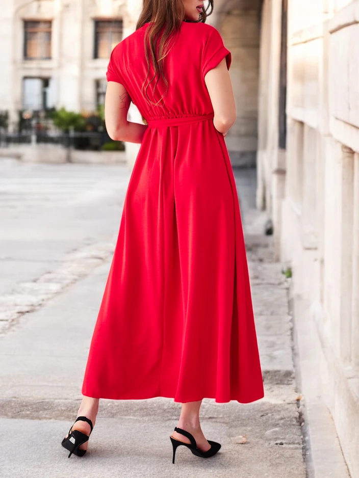 - Damen-Midikleid mit elastischem Bund. Modell mit kurzen Ärmeln, Wickelausschnitt und einem Gürtel. Ein Must-have in deinem Kleiderschrank!