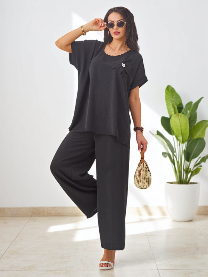 Royalfashion Damen set mit kurzen Ärmeln, dekorativer Blume und weiten Hosen