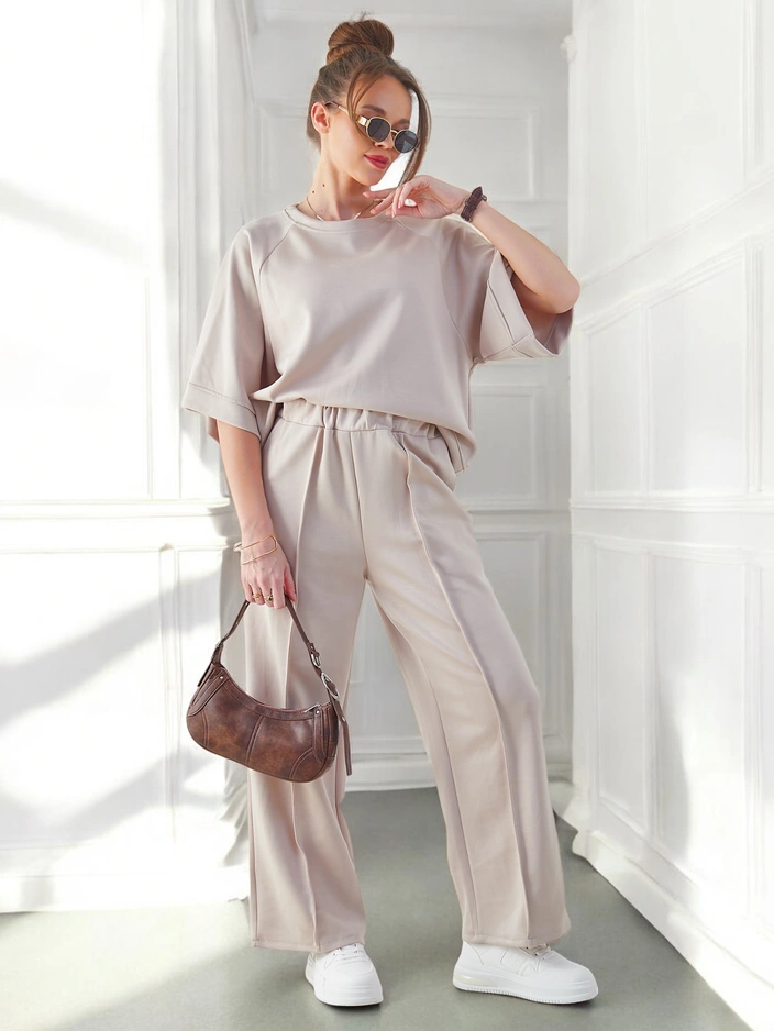 Royalfashion Damenoutfit mit kurzen Ärmeln und ausgestellten Hosen