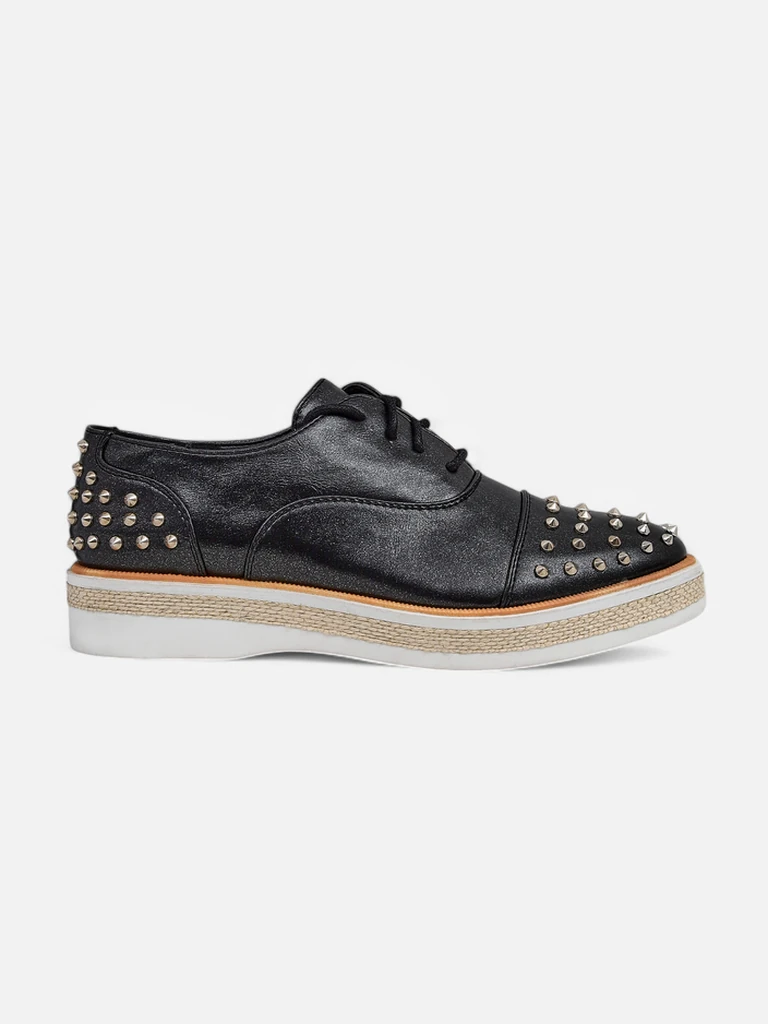 - Damenschuhe auf flacher Sohle. Obermaterial aus Eco-Leder, verziert mit Nieten, die Innensohle besteht aus Eco-Leder. Eine ideale Basis für Alltagsoutfits!