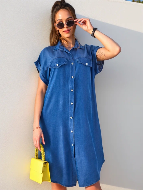 Royalfashion Knopfverschluss Damen Tunika Kleid Typ Denim
