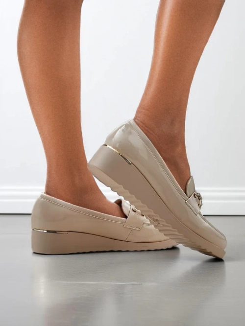 - Schöne Damenmokassins auf niedrigem Wedge. Das Modell hat einen lässigen Stil und besteht aus umweltfreundlichem Leder mit einer natürlichen Lederinnensohle. Die Zehenpartie ist abgerundet und mit goldenen Elementen verziert, die mit Strasssteinen versehe