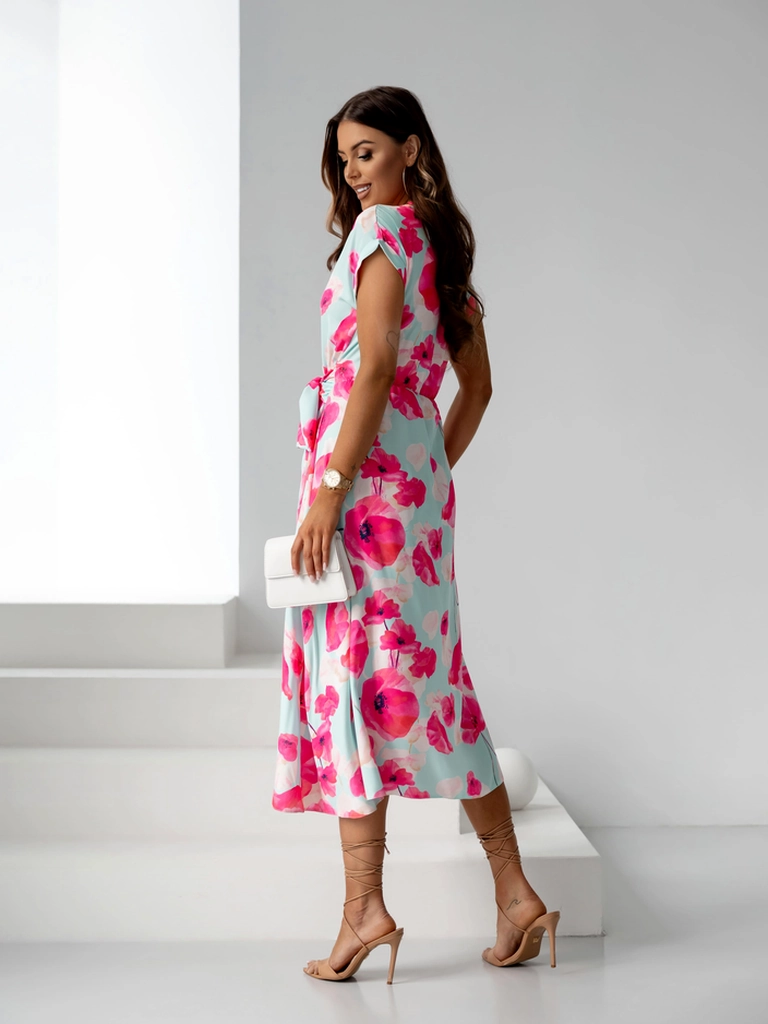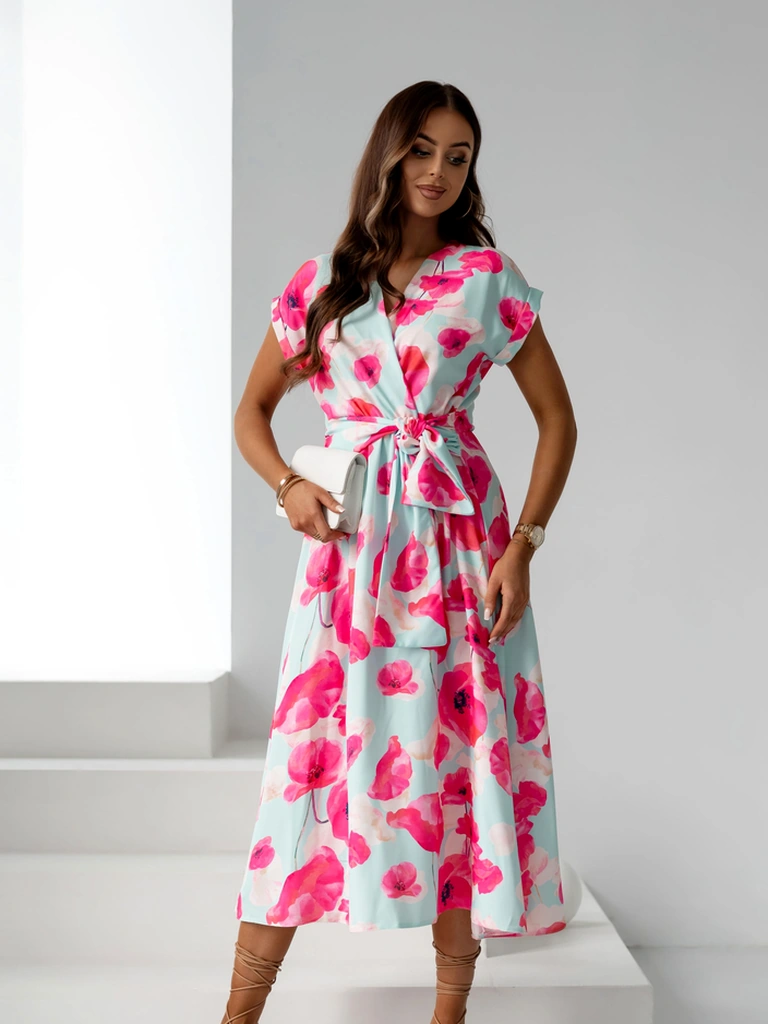 • Damen Midi-Kleid mit kurzen Ärmeln und Wickelausschnitt, verziert mit Frühlingsblumen – leicht, elegant und perfekt für warme Tage.