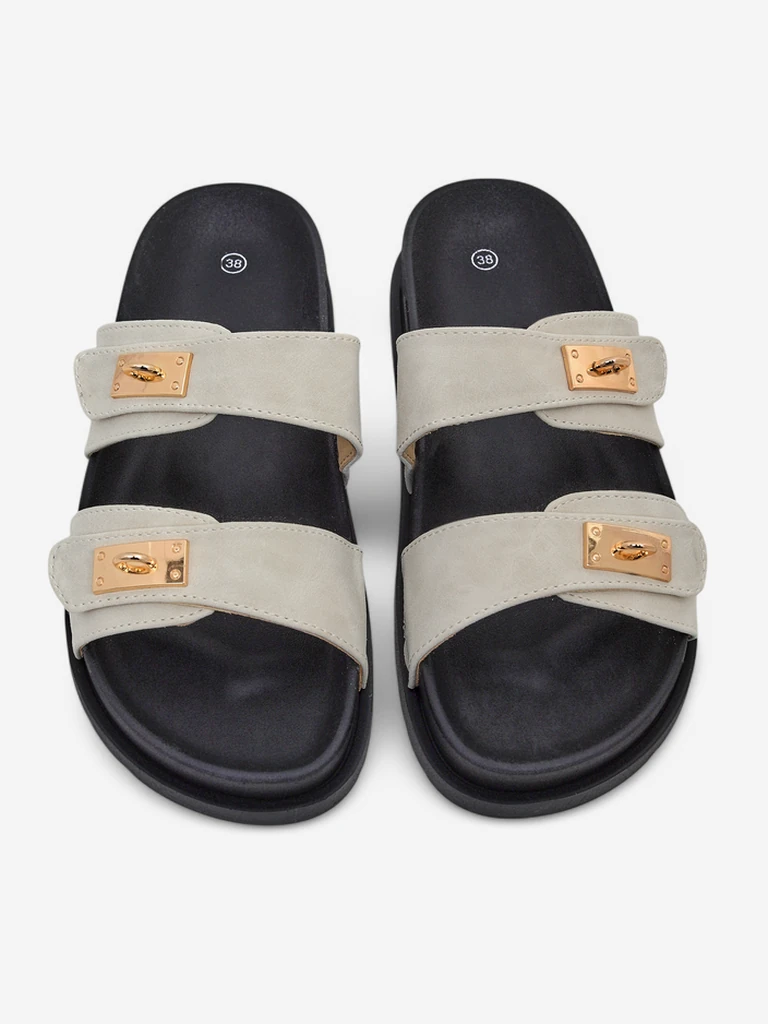 - Hausschuhe mit dickeren Sohlen sind eine Kombination aus Stil und Komfort. Ihr matter, ökologischer Lederriemen zusammen mit den Schnallen verleiht Charme und unterstreicht die Eleganz. Die ökologischen Lederinnensohle sorgt für Weichheit und Komfort bei