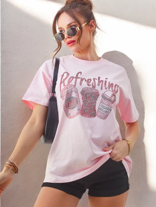 - Damen Baumwoll-T-Shirt mit einem Druck, der mit Strass verziert ist, verbindet Komfort mit einem subtilen Schimmer. Perfekt für lässige Styles verleiht es jedem Look einen einzigartigen Charme.