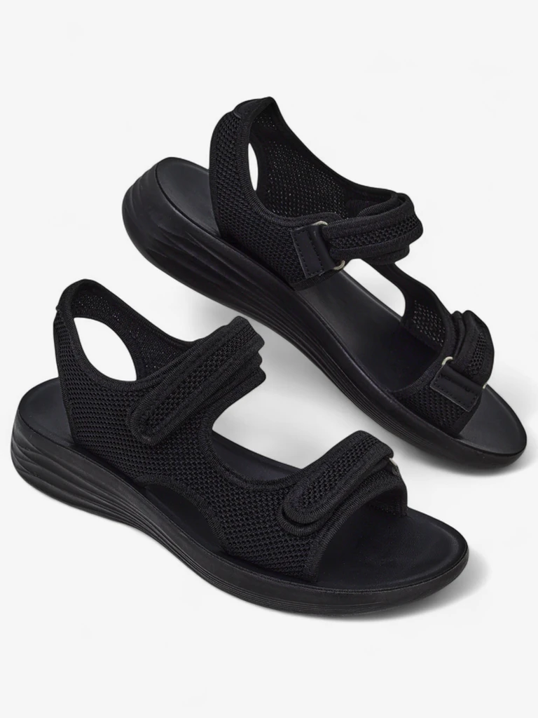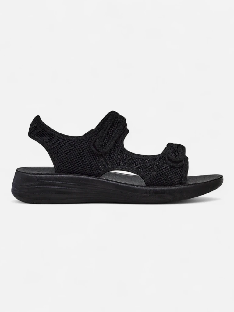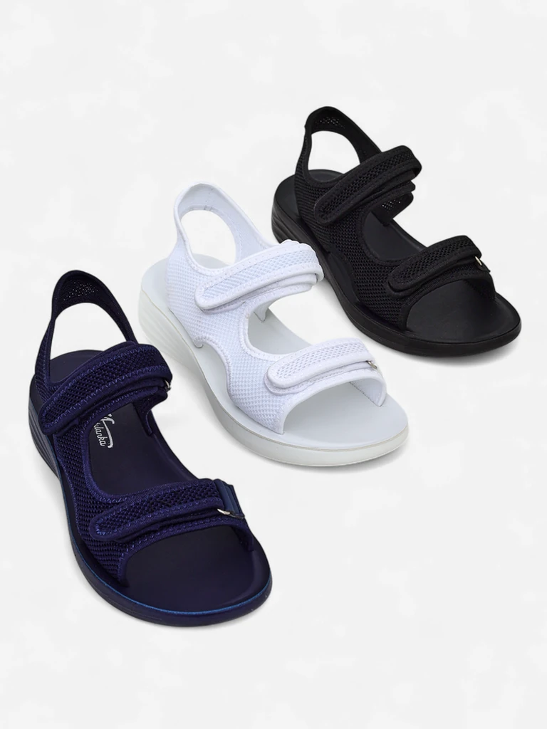 - Sportliche Damen Sandalen mit flacher Sohle, Stoffriemchen und Gummieinlegesohle. Diese Damen Schuhe werden mit Klettverschluss befestigt. Sie passen sich gut dem Fuß an!
