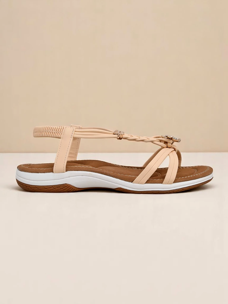 - Flache Damensandalen – die perfekte Idee für heiße Sommertage. Die Riemen bestehen aus bequemem, umweltfreundlichem Leder. Die Vorderseite ist mit eleganten geflochtenen Riemen und Zirkonia-Verzierungen geschmückt. Schlupfschuhe.