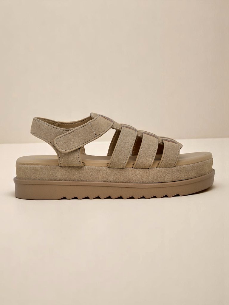 • Damen Römersandalen aus weichem Öko-Wildleder. Die Innensohle aus Öko-Leder sorgt für Komfort und der Klettverschluss erleichtert die Anpassung. Ideal für sommerliche Stylings.