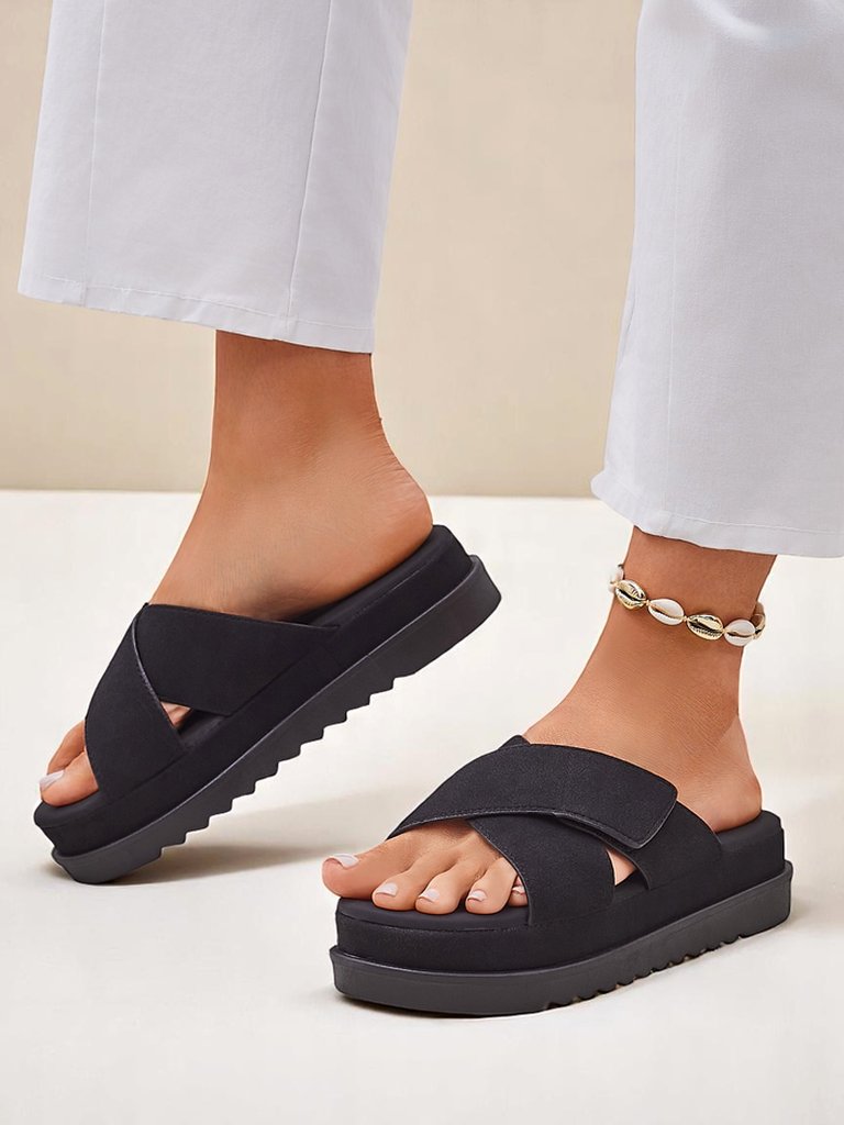 Die Nyx-Sandalen vereinen Komfort und Stil, perfekt für sommerliche Tage. Hergestellt aus hochwertigem Kunstvelours, bieten sie Weichheit und Tragekomfort. Die dicke, stabile Plateau-Sohle verleiht ihnen Charakter und entspricht den neuesten Trends.