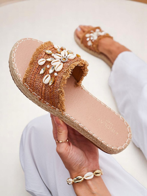 Royalfashion Callista Boho Camel Sandalen auf flacher Plattform mit Muscheln
