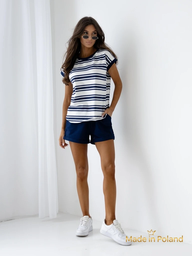 Royalfashion Baumwoll Damen-Set mit kurzen Ärmeln und gestreiften Shorts