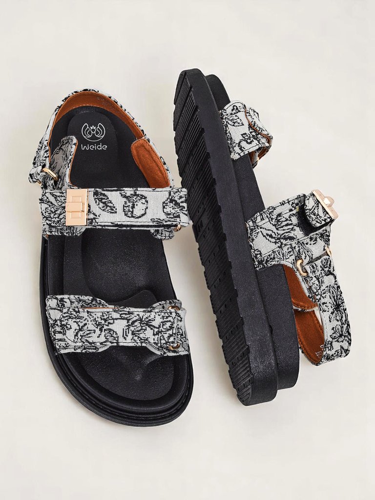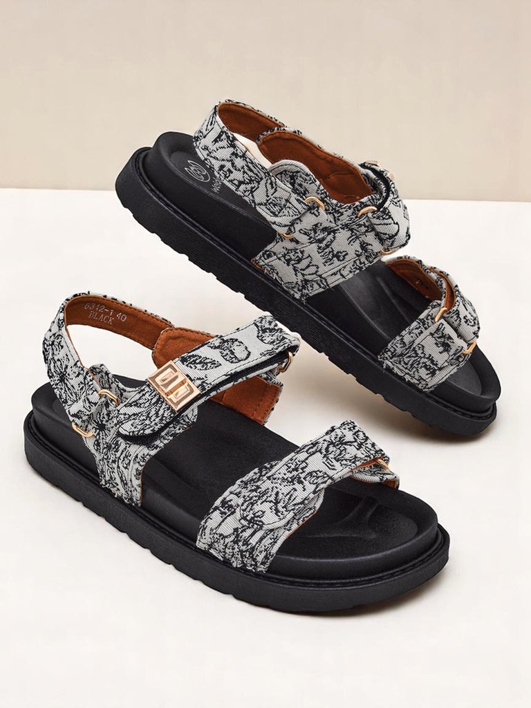 Die Sandalen-Oberseite besteht aus strapazierfähigem Stoff mit einem modischen schwarz-weißen Muster. Das Fußbett aus weichem Material sorgt für ganztägigen Tragekomfort. Die Plateau-Sohle aus leichtem, aber robustem Kunststoff garantiert Stabilität und Dämpfung. Goldene Schnallen verleihen den Sandalen Eleganz.