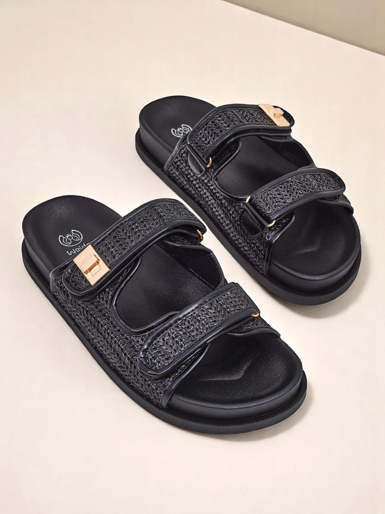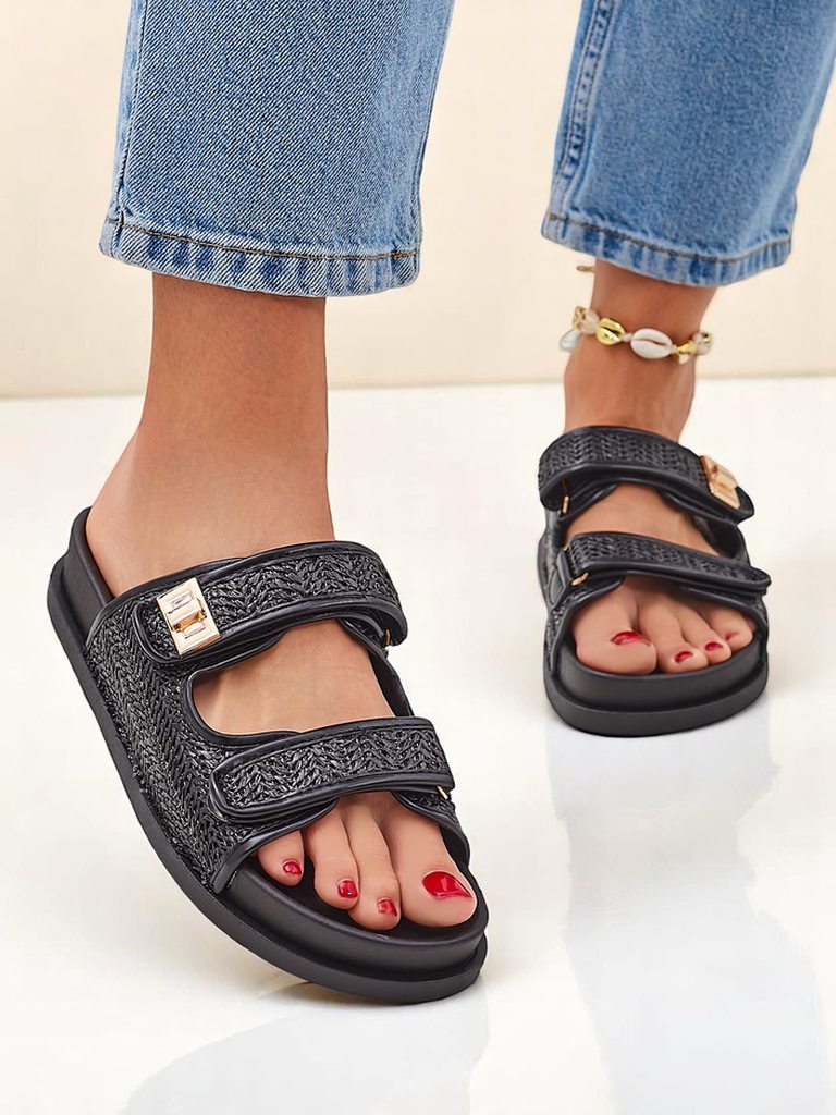 - Schicke Damen-Slipper-Sandalen aus Strohgewebe mit Kunststoffschließen. Gummisohle. Das Modell hat verstellbare Klettverschlüsse. Perfekt für Sommeroutfits!