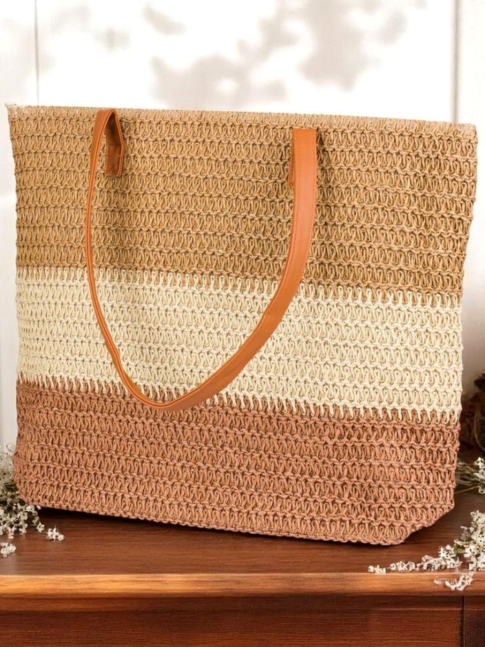 - Große geflochtene Strohtasche mit auffälligem, breitem Streifenmuster. 1 Hauptfach, Innentasche, Reißverschluss. Stilvoll, geräumig – perfekt für Sommer und Urlaub!