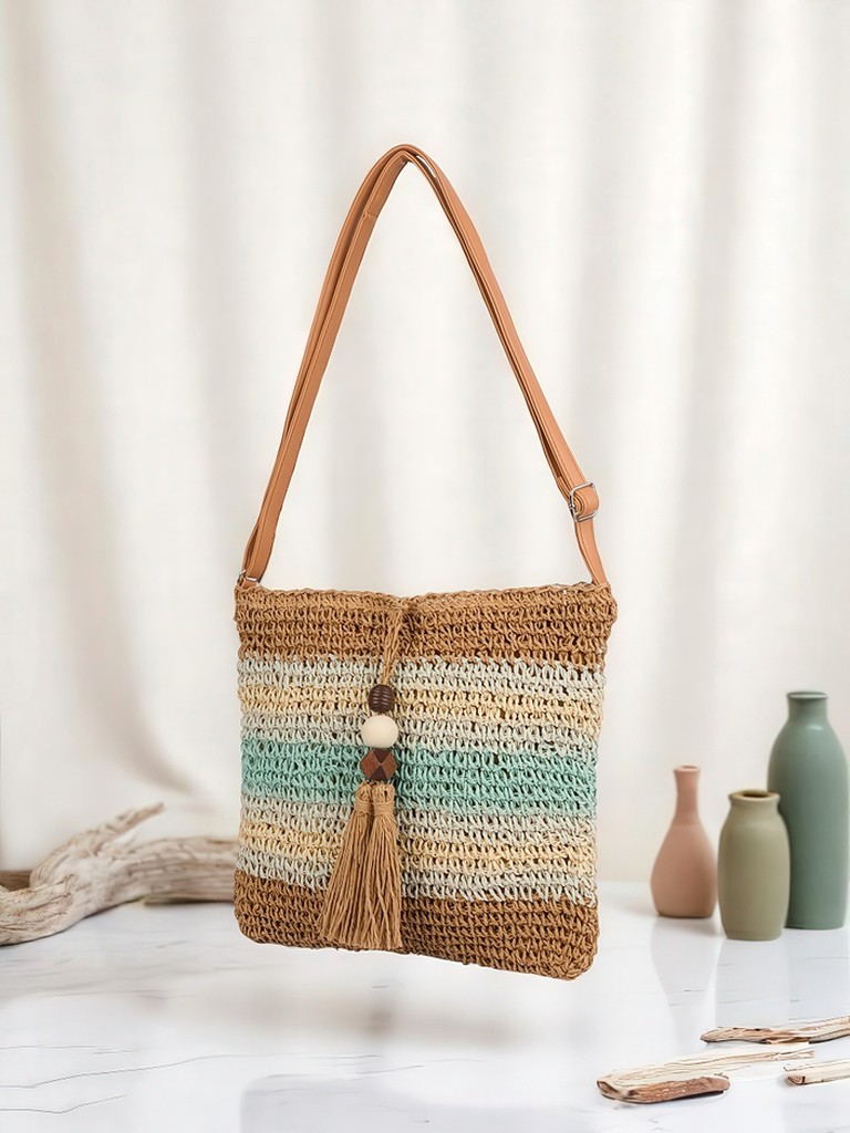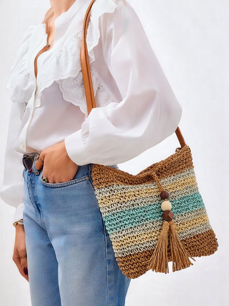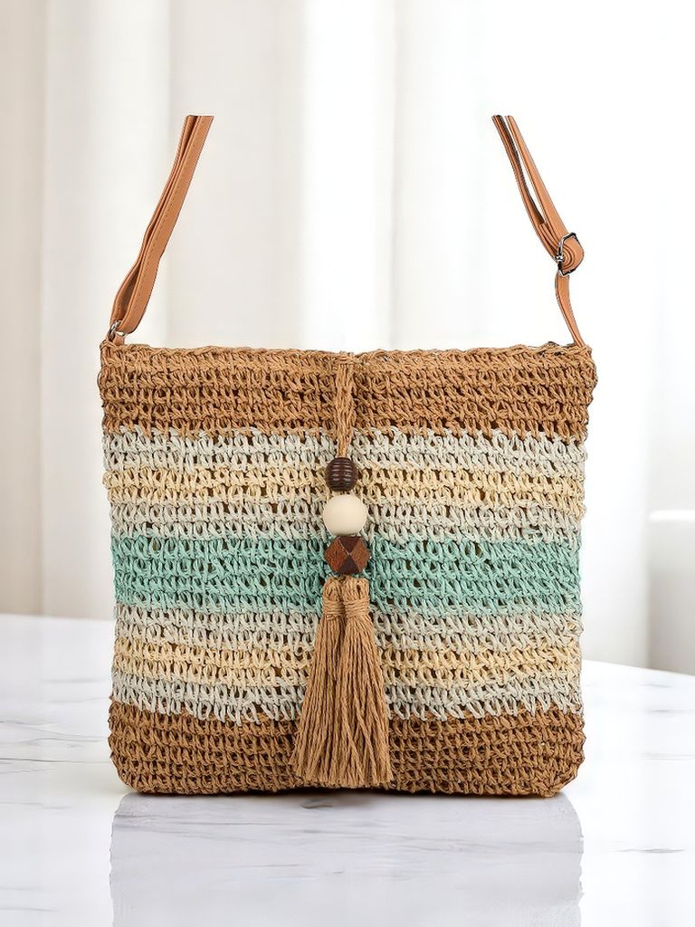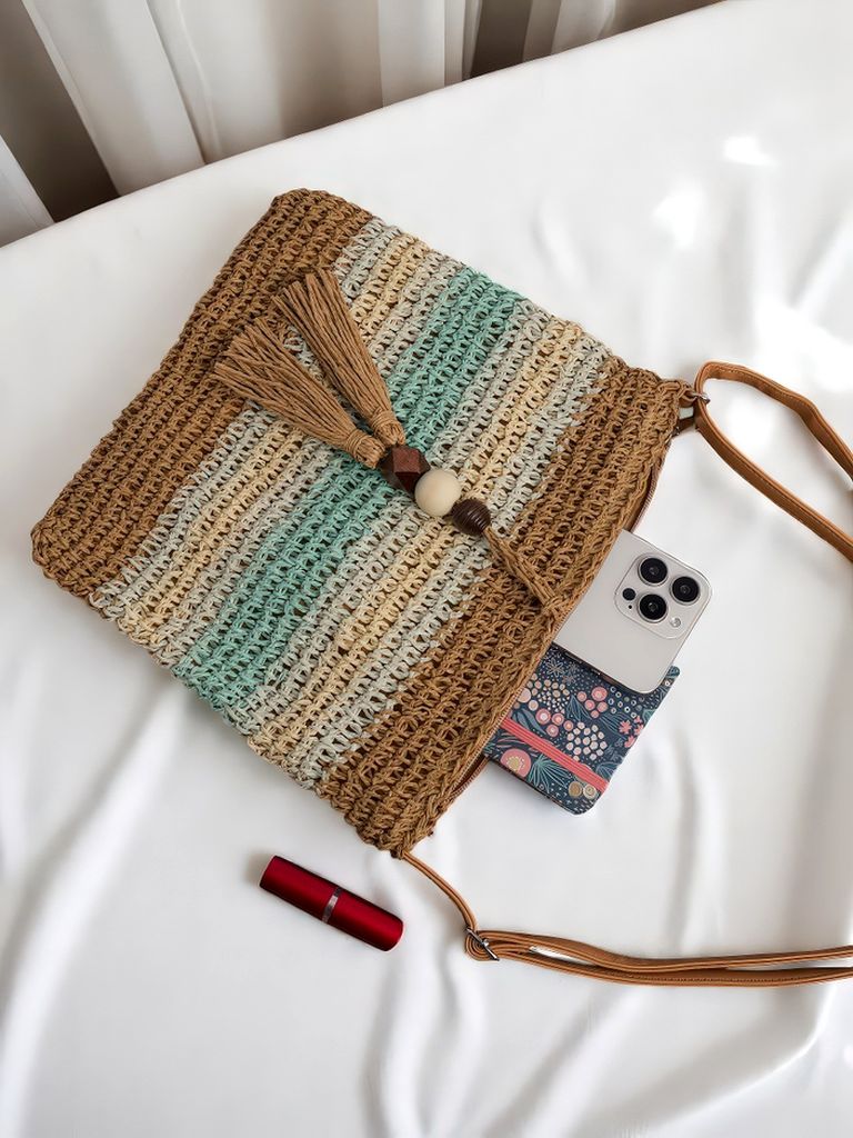 - Eine kleine geflochtene Strohtasche mit Streifenmuster und dekorativem Schlüsselanhänger. Sie hat ein Hauptfach, eine Innentasche und einen Reißverschluss. Stilvoll und leicht – perfekt für den Sommer und Spaziergänge!