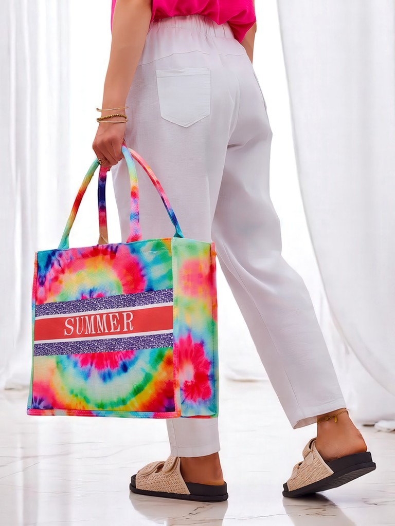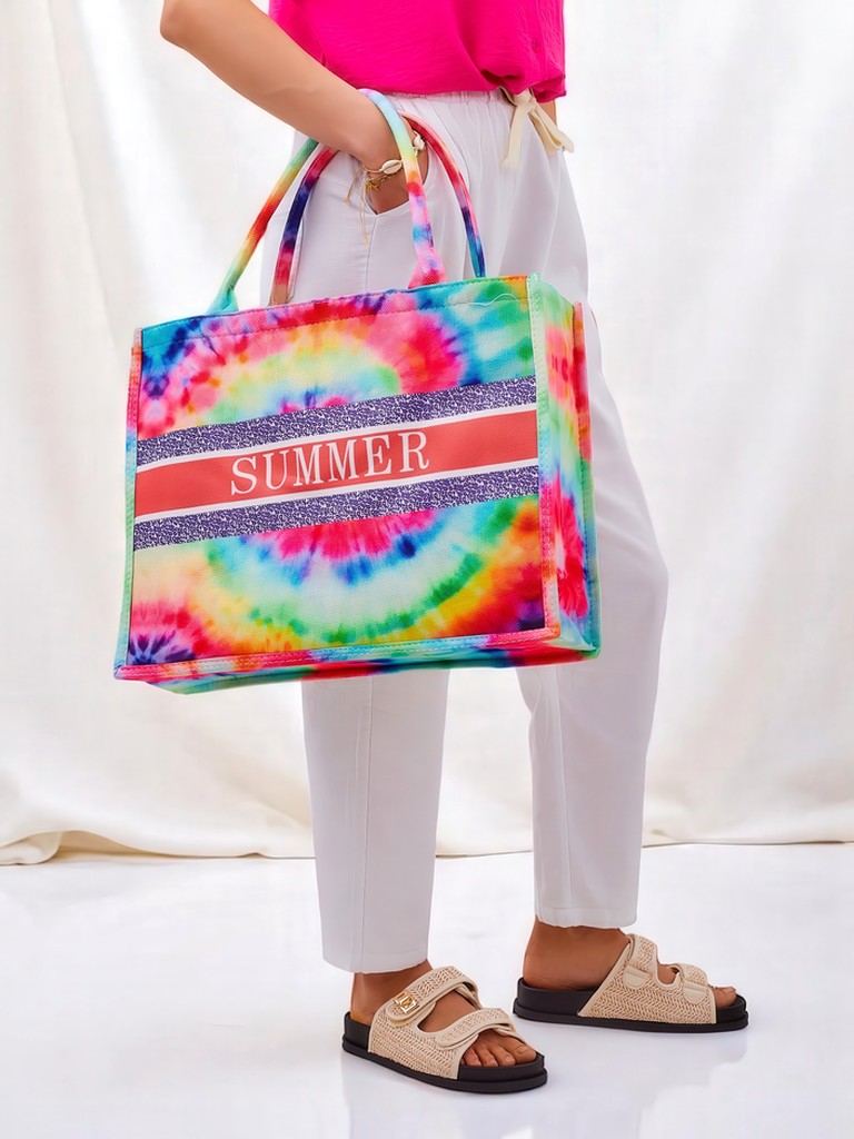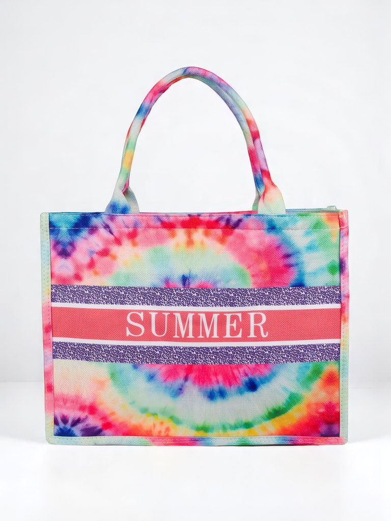 - Große Stofftasche für Damen mit buntem Motiv und dem Aufdruck "SUMMER". 1 Fach, leicht und geräumig – perfekt für Strand, Urlaub und Sommer-Outfits!