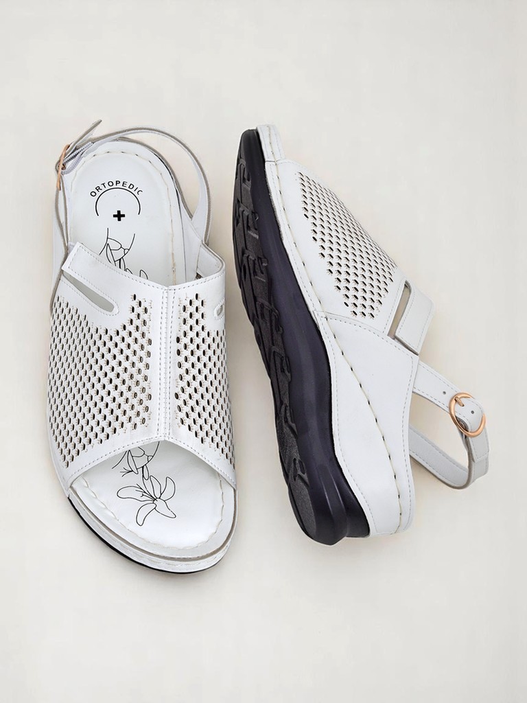 Calcebianca Sandalen vereinen italienischen Stil, antike Tradition und modernen Komfort. Gefertigt aus hochwertigem, natürlichem Narbenleder, garantieren sie nicht nur ein ästhetisches Aussehen, sondern auch eine lange Haltbarkeit. Die lasergeschnittenen Muster auf dem Obermaterial sorgen für eine hervorragende Belüftung und einen modischen, subtilen visuellen Effekt, der sich in die neuesten Trends der Sommerschuhe mit leichtem Retro-Charakter einfügt. Die Ledereinlegesohle mit Blumendruck und der zarte, verstellbare Riemenverschluss sorgen für eine Anpassung an die individuellen Bedürfnisse, schützen gleichzeitig den Fuß und stärken seine korrekte Positionierung.