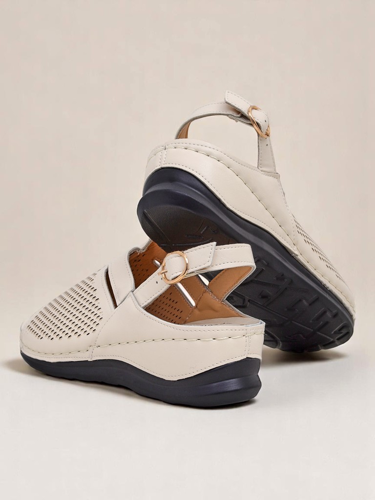 - Mira sind elegante Sandalen aus Öko-Leder mit niedrigem Keilabsatz. Das geschlossene Obermaterial und der Schnallenverschluss sorgen für Komfort und Stil im Alltag und bei besonderen Anlässen.