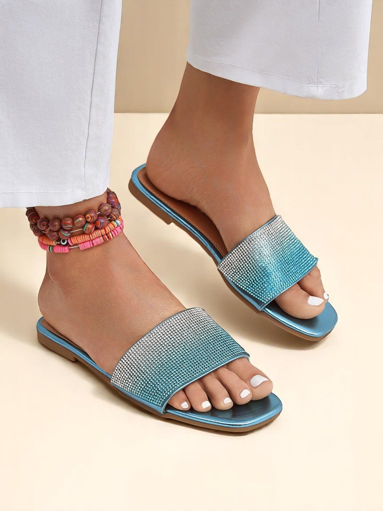 - Flache Damen-Pantoletten aus Öko-Leder, verziert mit Zirkonia und Ombre-Effekt. Stilvoll, glänzend und bequem – ideal für den Sommer und verleihen jedem Outfit einen Hauch von Glamour.