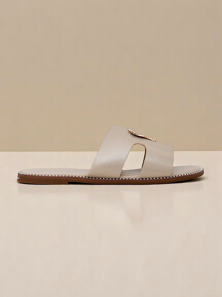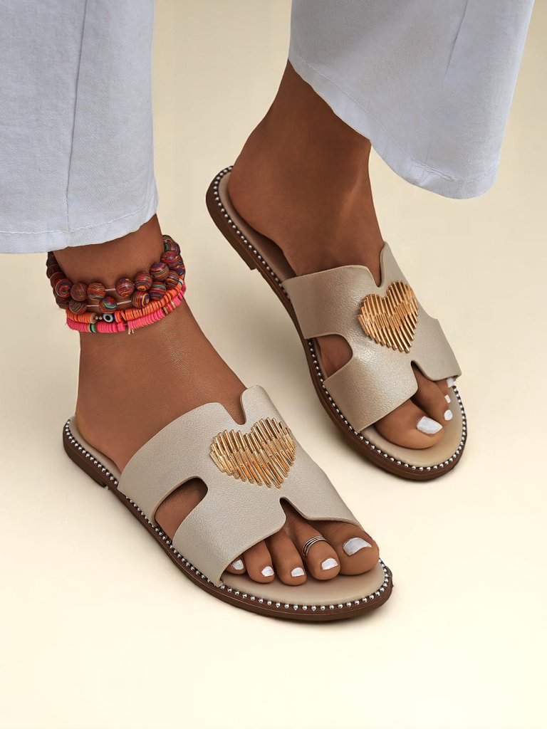 • Öko-Leder Pantoletten mit flacher Sohle und goldenem Herzdetail. Stil und Komfort vereint – ideal für den Sommer, Stadtspaziergänge und leichte, feminine Looks.