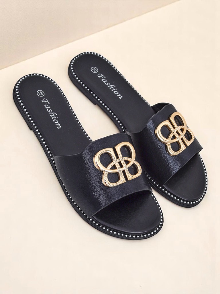 - Stilvolle Pantoletten aus Öko-Leder mit flacher Sohle, verziert mit einem goldenen Ornament. Komfort und Eleganz für jeden Tag, die jedem Sommeroutfit Glanz verleihen.