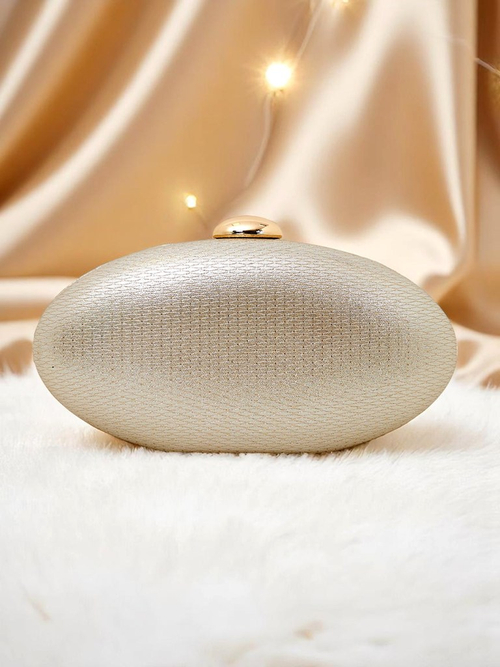 - Umschlagtasche in Ellipsenform aus Kunstleder, überzogen mit Stoff mit schimmerndem Faden und Prägung. Verschlossen mit Druckknopf, mit abnehmbarer Kette – Stil und Glanz!
