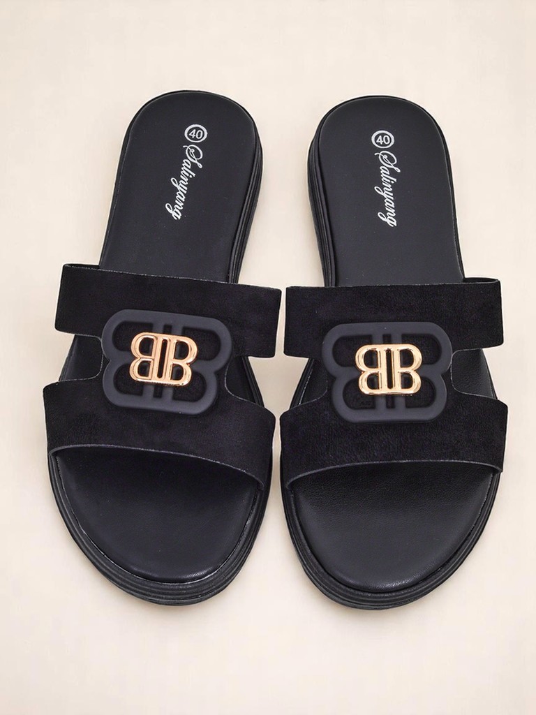 - Stilvolle, flache Pantoletten aus Öko-Wildleder mit einer Innensohle aus Öko-Leder. Auf der Schuhspitze mit einer eleganten Kunststoffapplikation verziert. Komfort und Chic, ideal für Sommertage.