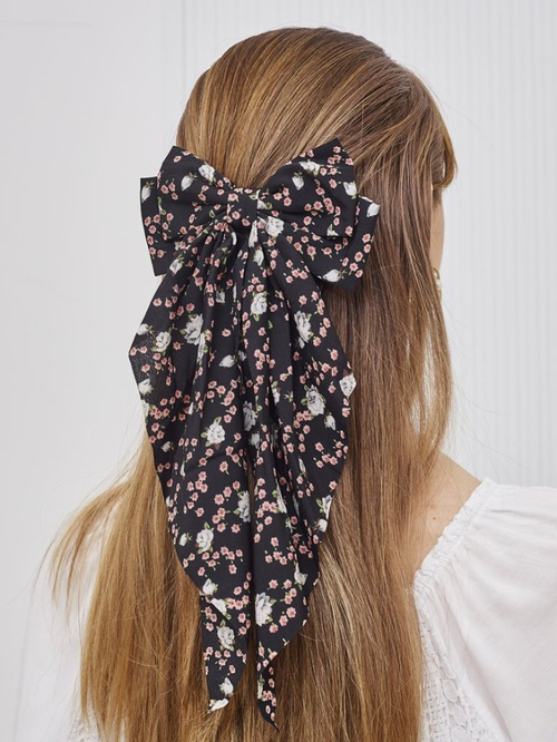 - Haarklammer mit einer Schleife und langen Bändern im Blumenmuster. Ein zartes, romantisches Accessoire, das Ihre Frisur wunderschön betont und jedem Look Leichtigkeit und Frische verleiht.