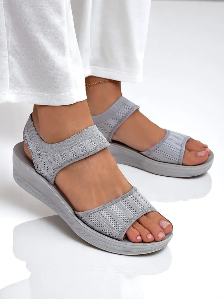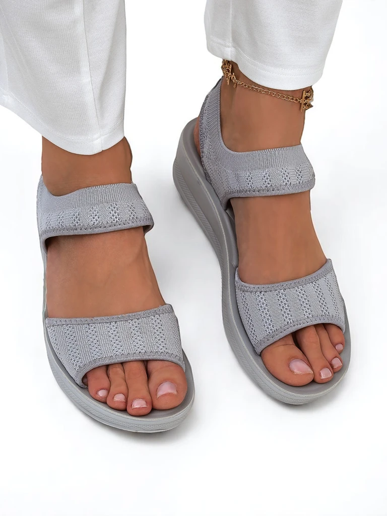 - Damen Sandalen mit dicker Sohle, zum Reinschlüpfen, mit bequemer Innensohle aus Öko-Leder. Flexible Stoffbänder passen sich dem Fuß an, und ein Gummiband am Knöchel sorgt für Stabilität und Tragekomfort. Ideal für den Sommer – leicht, praktisch und stilvo